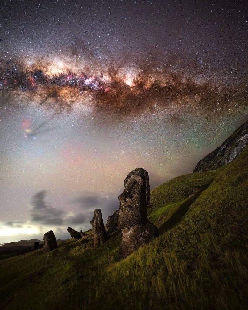این مجموعه شامل 12 تصویر منتخب از مناظر زمین و آسمان است که هر یک روایت متفاوتی از تعامل طبیعت و کیهان را به نمایش میگذارد. از عبور شهابسنگهای ورسید بر فراز استونهنج در ویلتشایر گرفته تا پرترهی سنگی نیاکان در جزیرهی رپانوی و شعلههای رنگین ساحل ژوراسیک دورست، هر عکس تجسمی از میراث طبیعی و کیهانی زمین است.